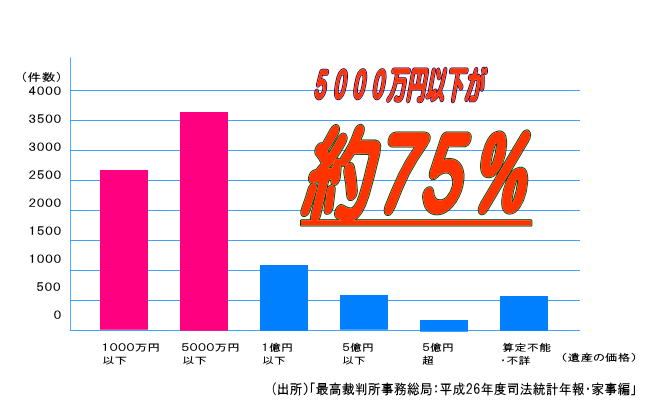 しかし実際は下のグラフのように、遺産相続でもめた方の大半が遺産価格が5000万円以下であり、1000万円以下で見ても30パーセントを超えています。